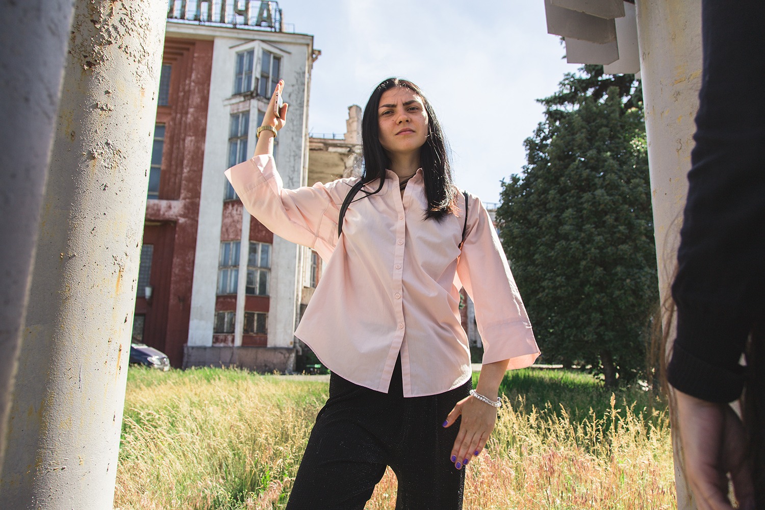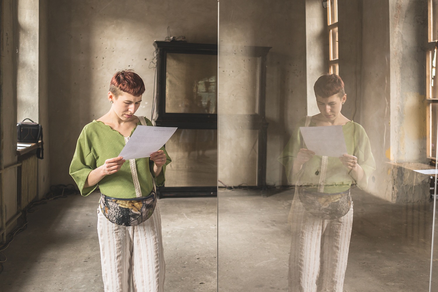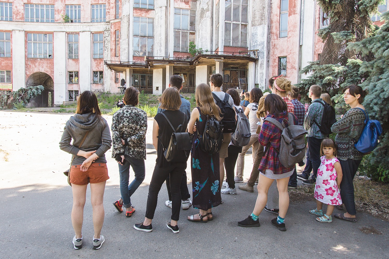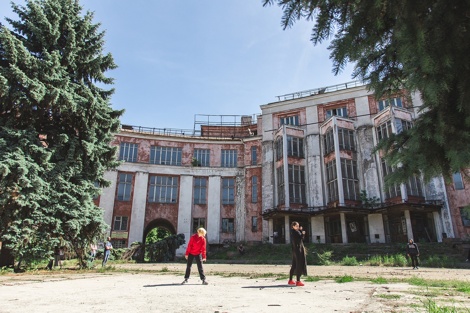 Olia Sosnovskaya in her site-specific performance Not Yet, Not Yet. Again and Again, focused on the history and the present context of the Ilyich cultural center. Huge building, which used to be one of the biggest cultural centers in Eastern Europe affiliated with a large industrial factory, has been abandoned for several years by now and is slowly decaying because its maintenance is very expensive for the city. Having gathered a group of semi professional or young dancers, Olia created a performative narrative around the building, which was based on their personal stories and emotional memories about the center, which history sums up the communistic past of Ukraine and the process of decommnuzation that it is going through right now.